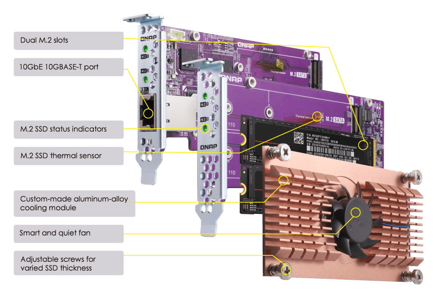 The QM2-2P10G1TB allows you to easily add two M.2 NVMe SSDs and 10GbE RJ45 connectivity to your QNAP NAS. Compared with the SATA interface, the QM2-2P10G1TB's PCIe Gen3 x 8 interface provides higher bandwidth to deliver faster computing speed and data access.